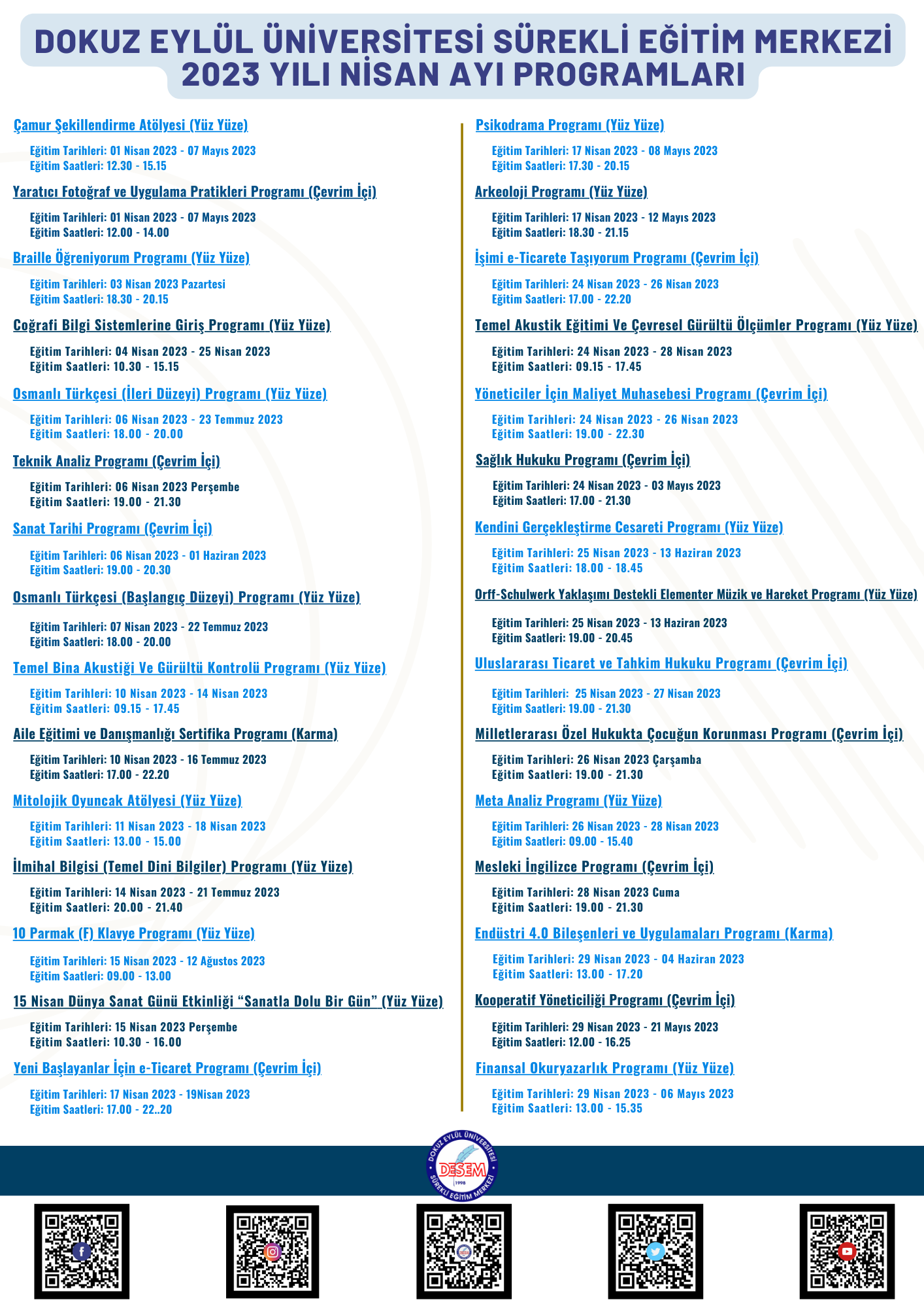 Dokuz Eylül Üniversitesi Sürekli Eğitim Merkezi (DESEM) tarafından Nisan ayında açılması planlanan programlar için tıklayınız.