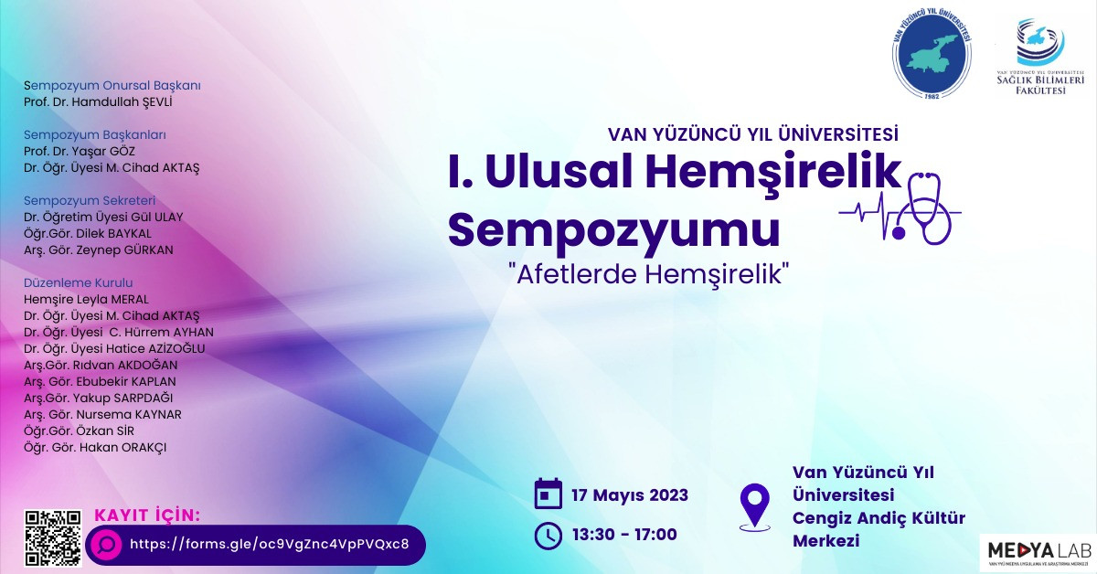 Van Yüzüncü Yıl Üniversitesi Sağlık Bilimleri Fakültesi tarafından 17.05.2023 tarihinde Prof. Dr. Cengiz Andiç Kültür Merkezi'nde 13.30-17.00 saatleri arasında 1. Ulusal Hemşirelik Sempozyumu "Afetlerde Hemşirelik" düzenlenecektir.