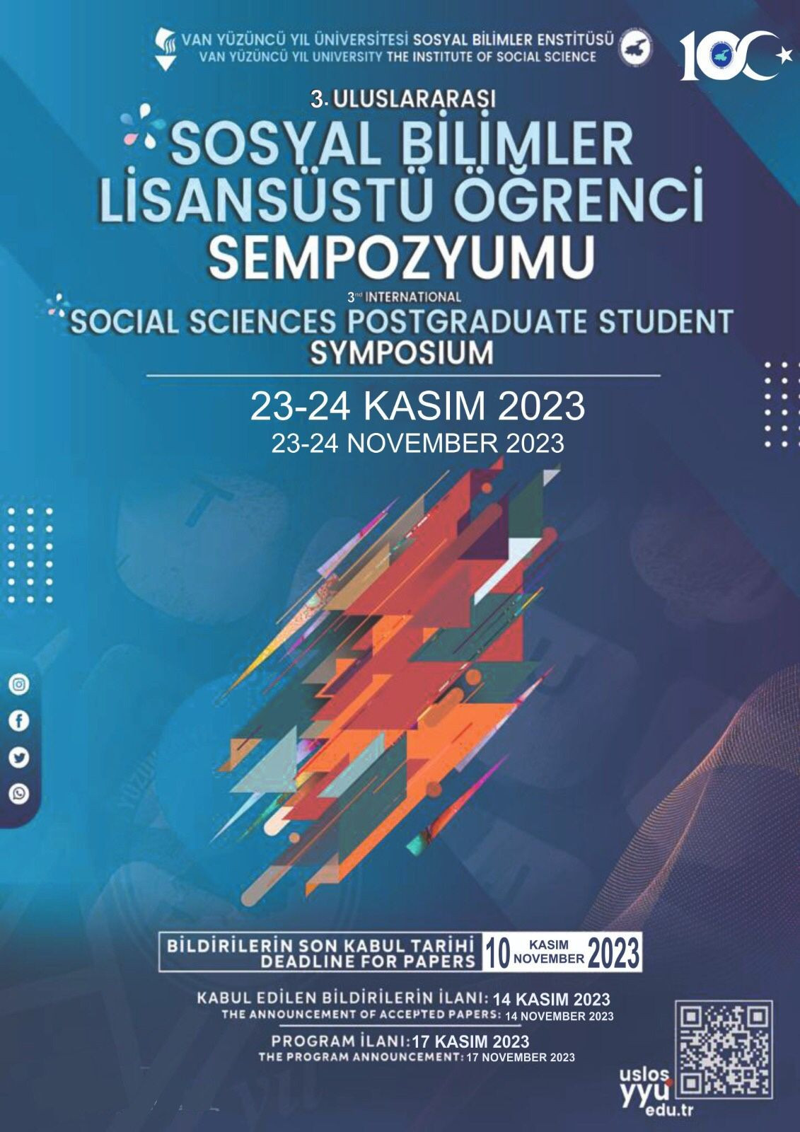 Van Yüzüncü Yıl Üniversitesi Sosyal Bilimler Enstitüsü tarafından 23-24 Kasım 2023 tarihlerinde Prof. Dr. Cengiz Andiç Kültür Merkezi'nde "3. Uluslararası Sosyal Bilimler Lisansüstü Öğrenci Sempozyumu" düzenlenecektir.