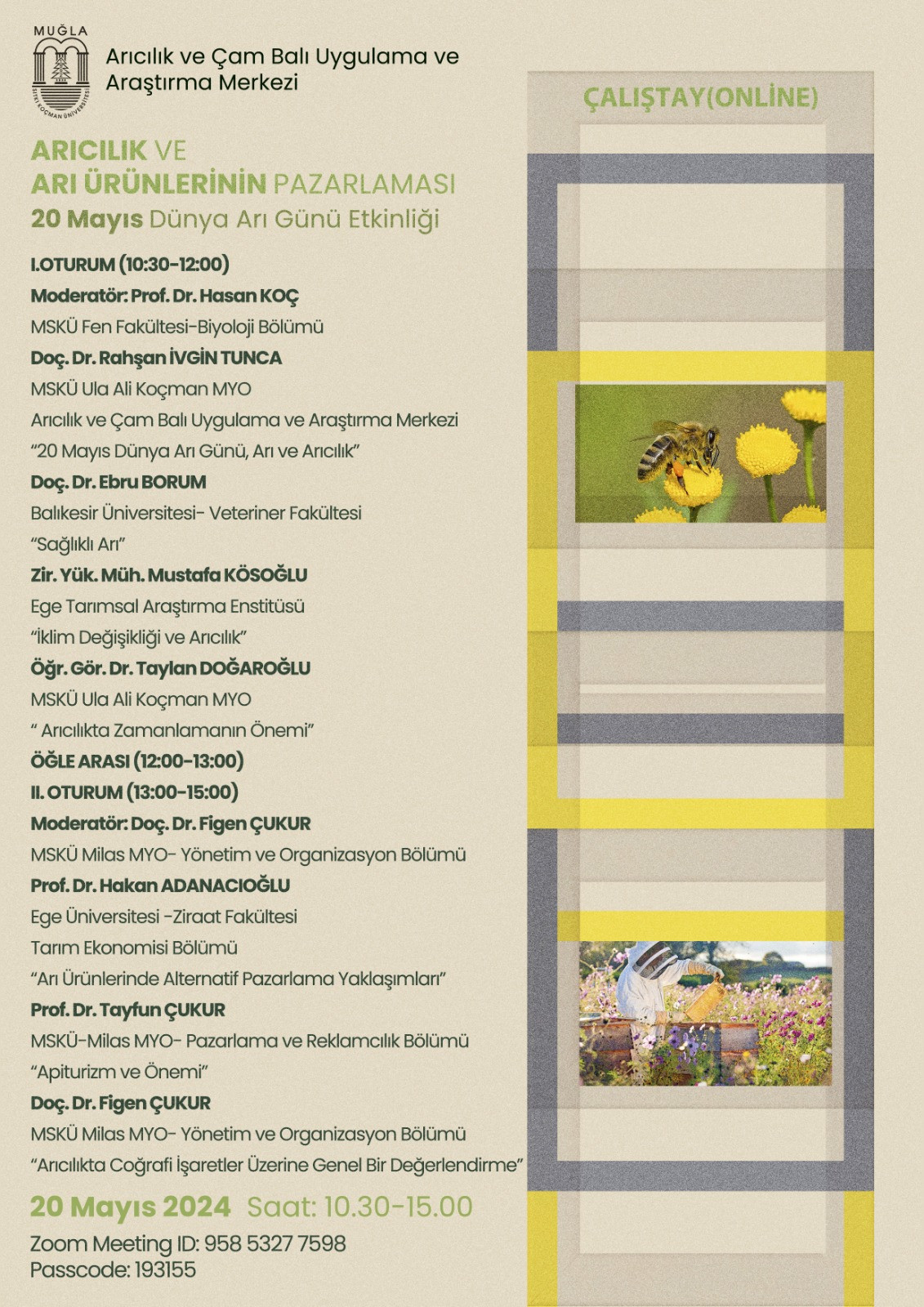 Muğla Sıtkı Koçman Üniversitesi Arıcılık ve Çam Balı Uygulama ve Araştırma Merkezi tarafından 20 Mayıs 2024 tarihinde Arıcılık ve Arı Ürünlerinin Pazarlanması başlıklı online çalıştay düzenlenecektir.
