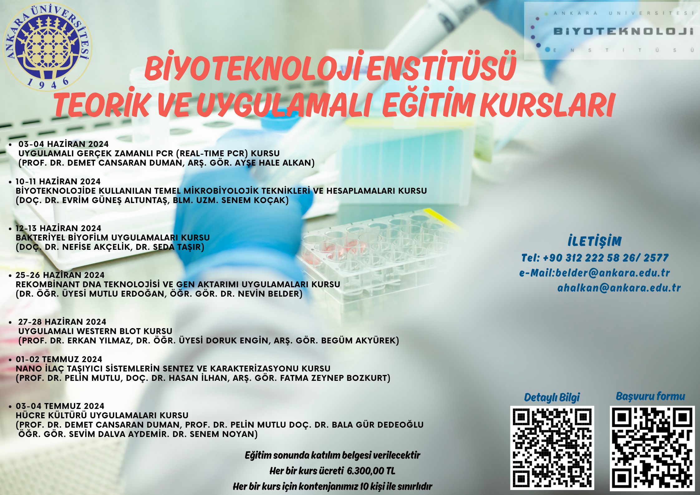 Ankara Üniversitesi Biyoteknoloji Enstitüsü tarafından, yaşam bilimleri ile biyoteknoloji alanlarında farklı amaçlar için kullanılan temel ve güncel yöntemler hakkında genel bilgilerin, yöntemlerin, teorik, pratik olarak kurslar düzenlenecektir.