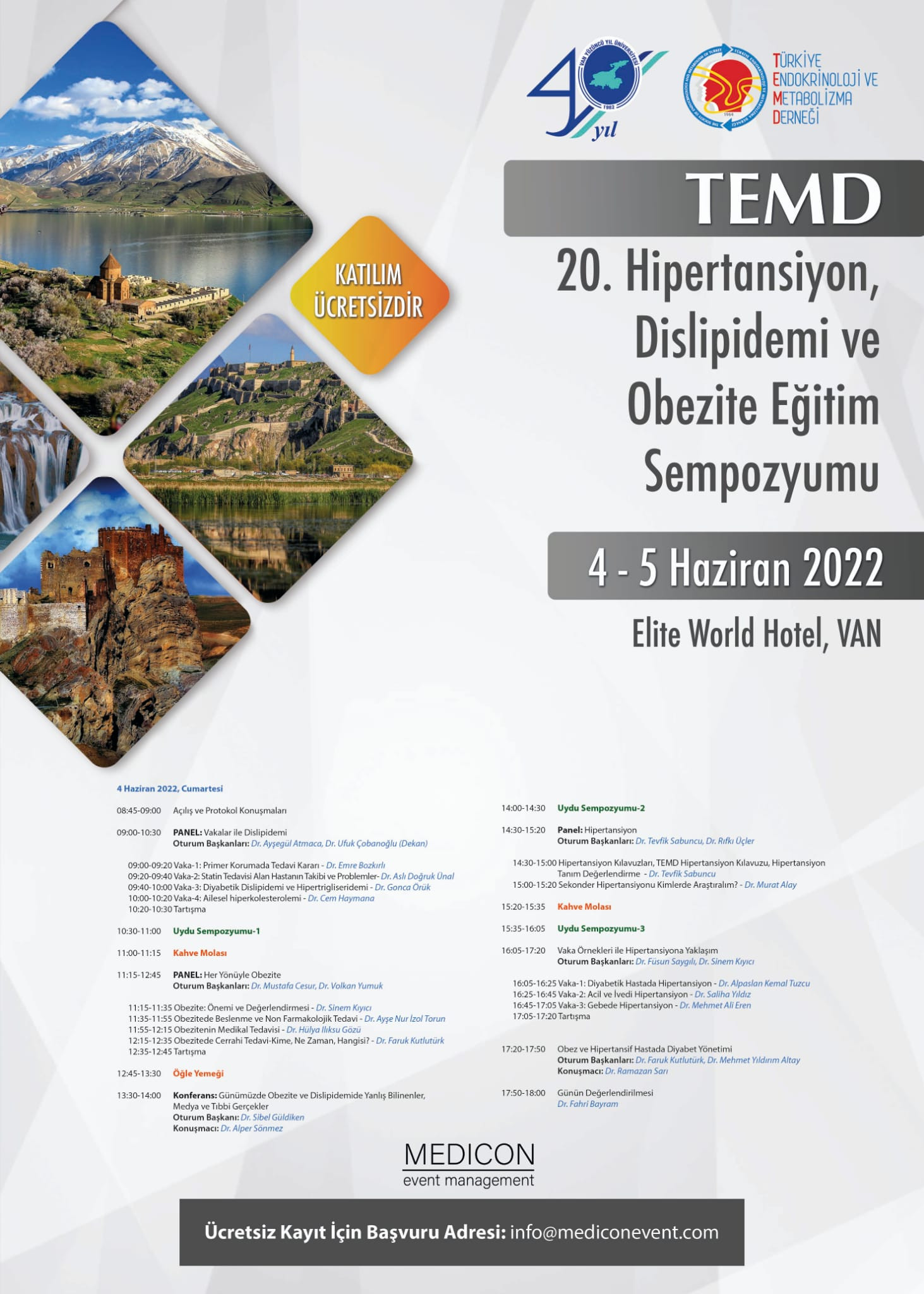 Van Yüzüncü Yıl Üniversitesi Tıp Fakültesi Endokrinoloji ve Metabolizma Hastalıkları Bilim Dalı tarafından 04.06.2022 tarihinde saat 08.45'te Van Elite World Otel'de “20. Hipertansiyon, Dislipidemi ve Obezite Eğitim Sempozyumu” düzenlenecektir.