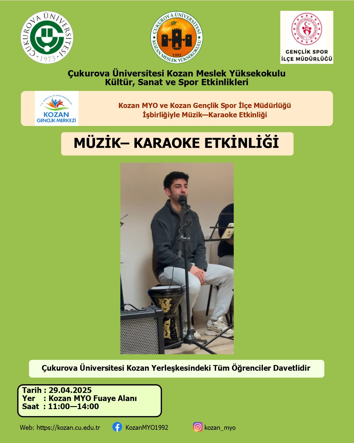Kozan MYO ile Kozan Gençlik Spor İlçe Müdürlüğü İşbirliğiyle Müzik-Karaoke Etkinliği 29 Nisan 2025 Salı günü 11.00-14.00 saatleri arası Yüksekokulumuz fuaye alanında gerçekleştirilecektir. Kozan Meslek Yüksekokulu ve Kozan İşletme Fakültesi öğrencilerimizi bekliyoruz.