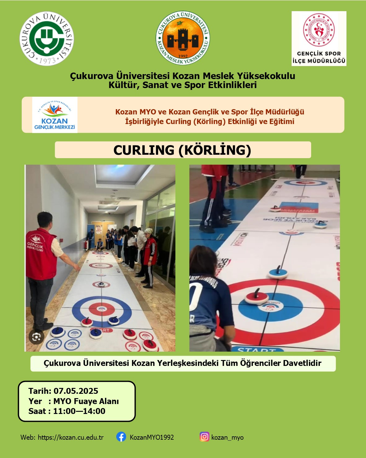 Kozan MYO ile Kozan Gençlik Spor İlçe Müdürlüğü işbirliğiyle Curling (Körling) Eğitimi ve Etkinliği 7 Mayıs 2025 Çarşamba günü 11.00-14.00 saatleri arası Yüksekokulumuz fuaye alanında gerçekleştirilecektir. Kozan Meslek Yüksekokulu ve Kozan İşletme Fakültesi öğrencilerimizi bekliyoruz.