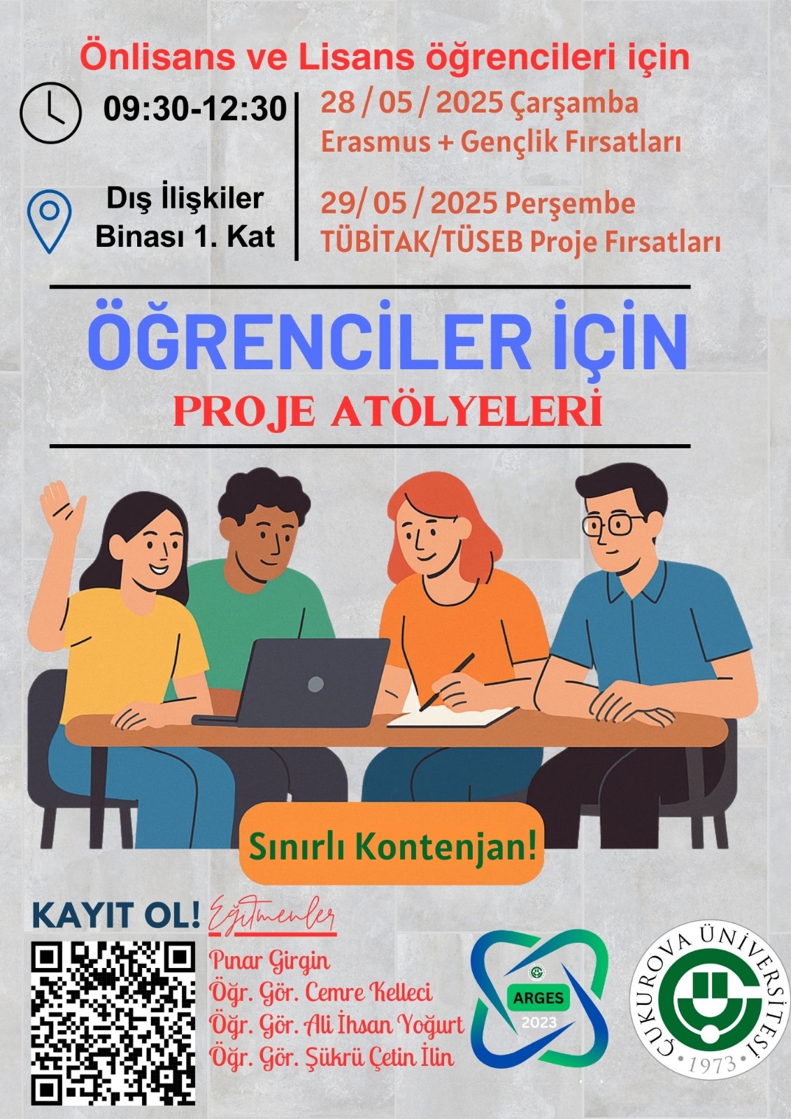 Üniversitemiz Araştırma ve Geliştirme Stratejileri (ARGES) Koordinatörlüğü tarafından, lisans ve önlisans öğrencilerine yönelik olarak, proje kültürünün yaygınlaştırılması ve ulusal/uluslararası destek programlarına ilişkin farkındalığın artırılması amacıyla “Öğrenciler İçin Proje Atölyeleri” başlıklı bir etkinlik düzenlenecektir.