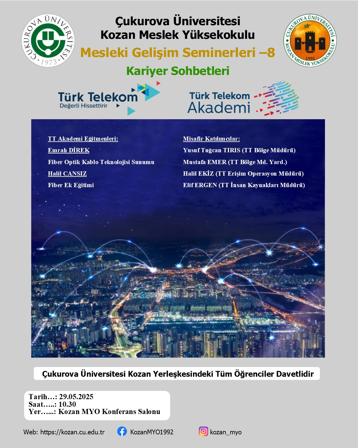 Meslek Yüksekokulumuzun düzenlemiş olduğu mesleki gelişim seminerlerinin sekizincisi Türk Telekom iş birliğiyle 29 Mayıs 2025 Perşembe günü saat 10.30’da Yüksekokulumuz Konferans Salonunda yapılacaktır. Türk Telekom Akademi Eğitmenleri Emrah DİREK ve Halil CANSIZ ile misafir katılımcılar TT Bölge Müdürü Yusuf Tuğcan TIRIS, TT Bölge Müdür Yardımcısı Mustafa EMER, TT Erişim Operasyon Müdürü Halil EKİZ ve TT İnsan Kaynakları Müdürü Elif ERGEN’in katılımlarıyla “Kariyer Sohbetleri” gerçekleştirilecektir. Kozan Meslek Yüksekokulu ve Kozan İşletme Fakültesi öğrencilerimizi bekliyoruz.