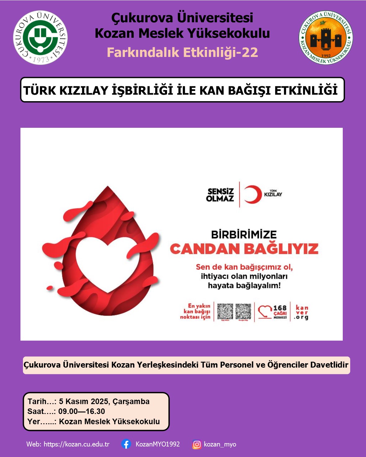 Farkındalık etkinliklerimiz kapsamında Türk Kızılay işbirliği ile yapılan "Kan Bağışı Etkinliği" 5 Kasım 2025 Çarşamba günü 09.00- 16.30 saatleri arasında Yüksekokulumuzda gerçekleştirilecektir. Tüm personel ve öğrencilerimiz davetlidir.
