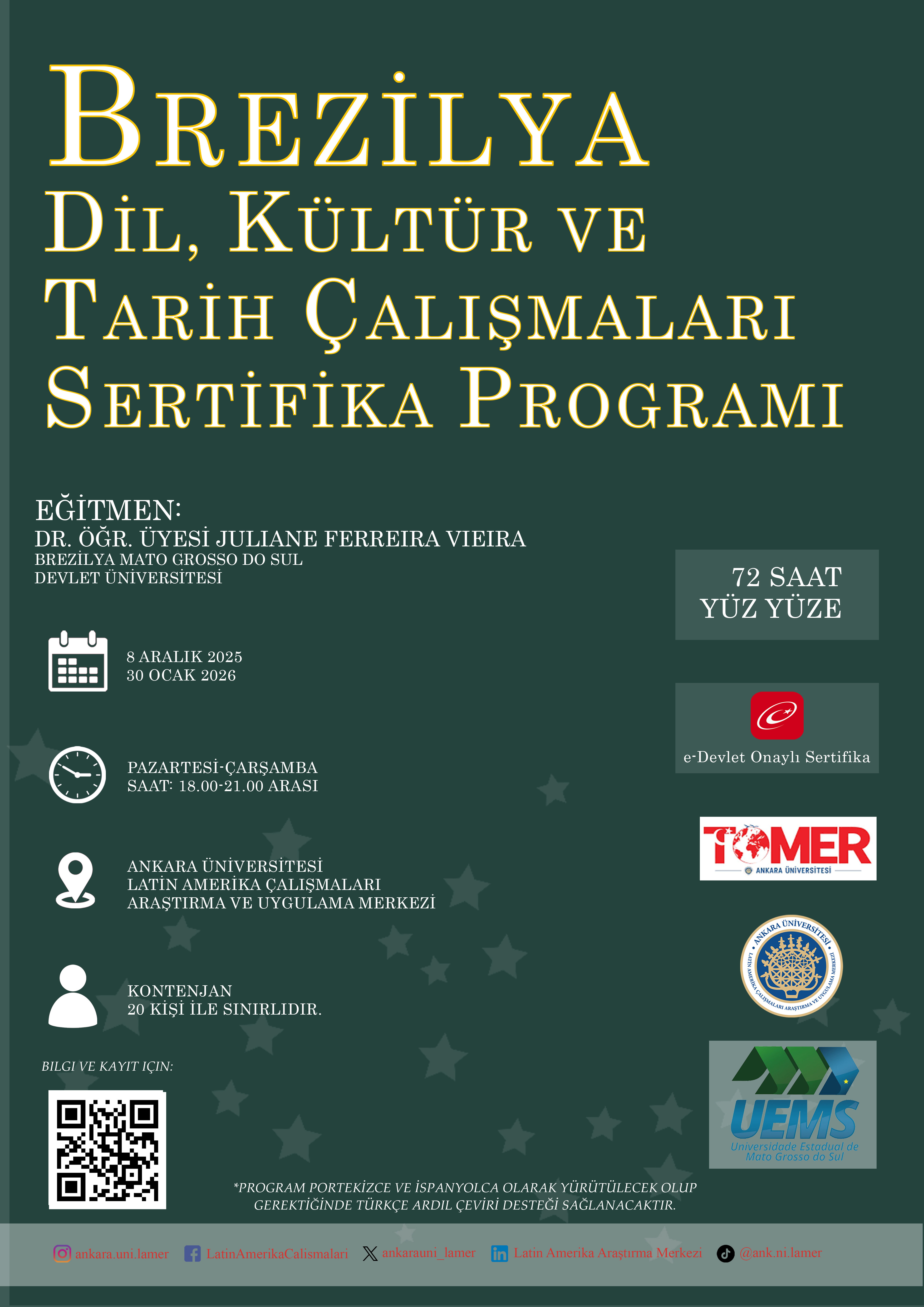 Ankara Üniversitesi Türkçe ve Yabancı Dil Uygulama ve Araştırma Merkezi (TÖMER) ile Latin Amerika Çalışmaları Araştırma ve Uygulama Merkezi işbirliği ile 08 Aralık 2025-30 Ocak 2026 tarihleri arasında "Brezilya Dil, Kültür ve Tarih Çalışmaları" başlıklı sertifika programı düzenlenecektir.
