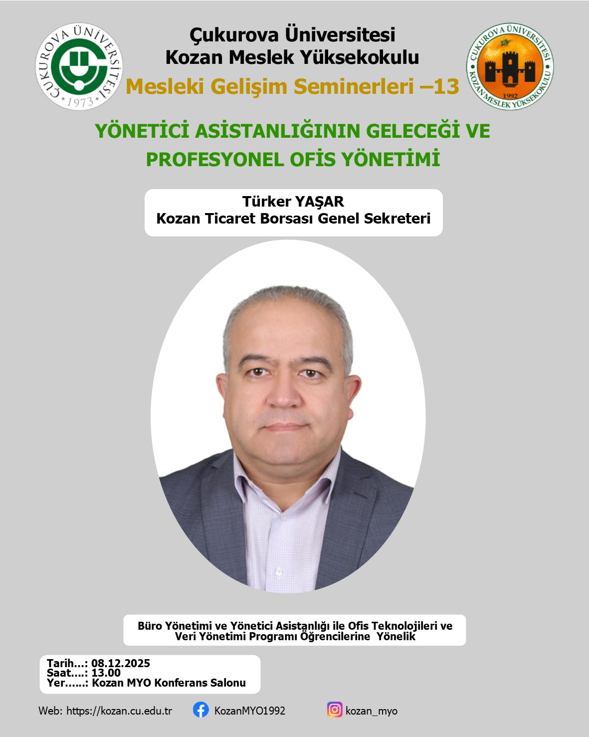 Meslek Yüksekokulumuzun düzenlemiş olduğu mesleki gelişim seminerlerinin on üçüncüsü 08.12.2025 Pazartesi günü saat 13.00’te Kozan Ticaret Borsası Genel Sekreteri Türker YAŞAR’ın katılımlarıyla Yüksekokulumuz Konferans Salonunda yapılacaktır. Seminerimiz Büro Yönetimi ve Yönetici Asistanlığı ile Ofis Teknolojileri ve Veri Yönetimi Programı öğrencilerine yönelik olacaktır.