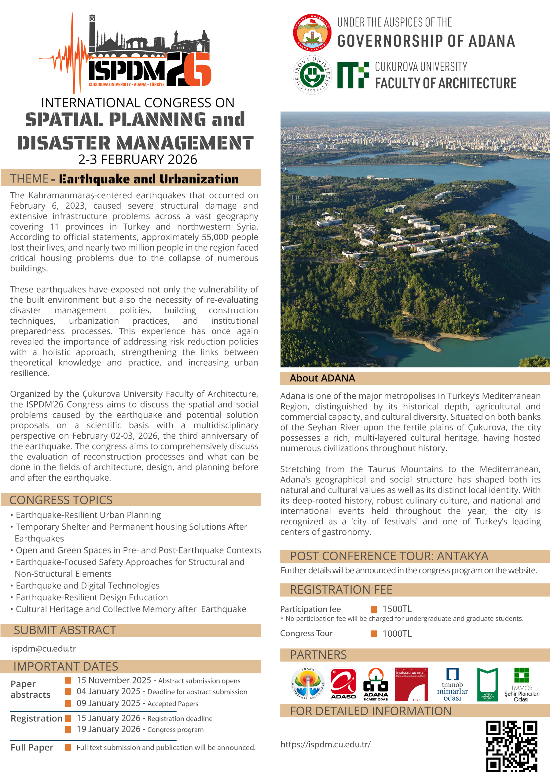 Çukurova Üniversitesi ev sahipliğinde 2-3 Şubat 2026 tarihlerinde düzenlenecek olan Uluslararası Mekansal Planlama ve Afet Yönetimi Kongresi’ne siz değerli araştırmacıları davet etmekten büyük mutluluk duyuyoruz.