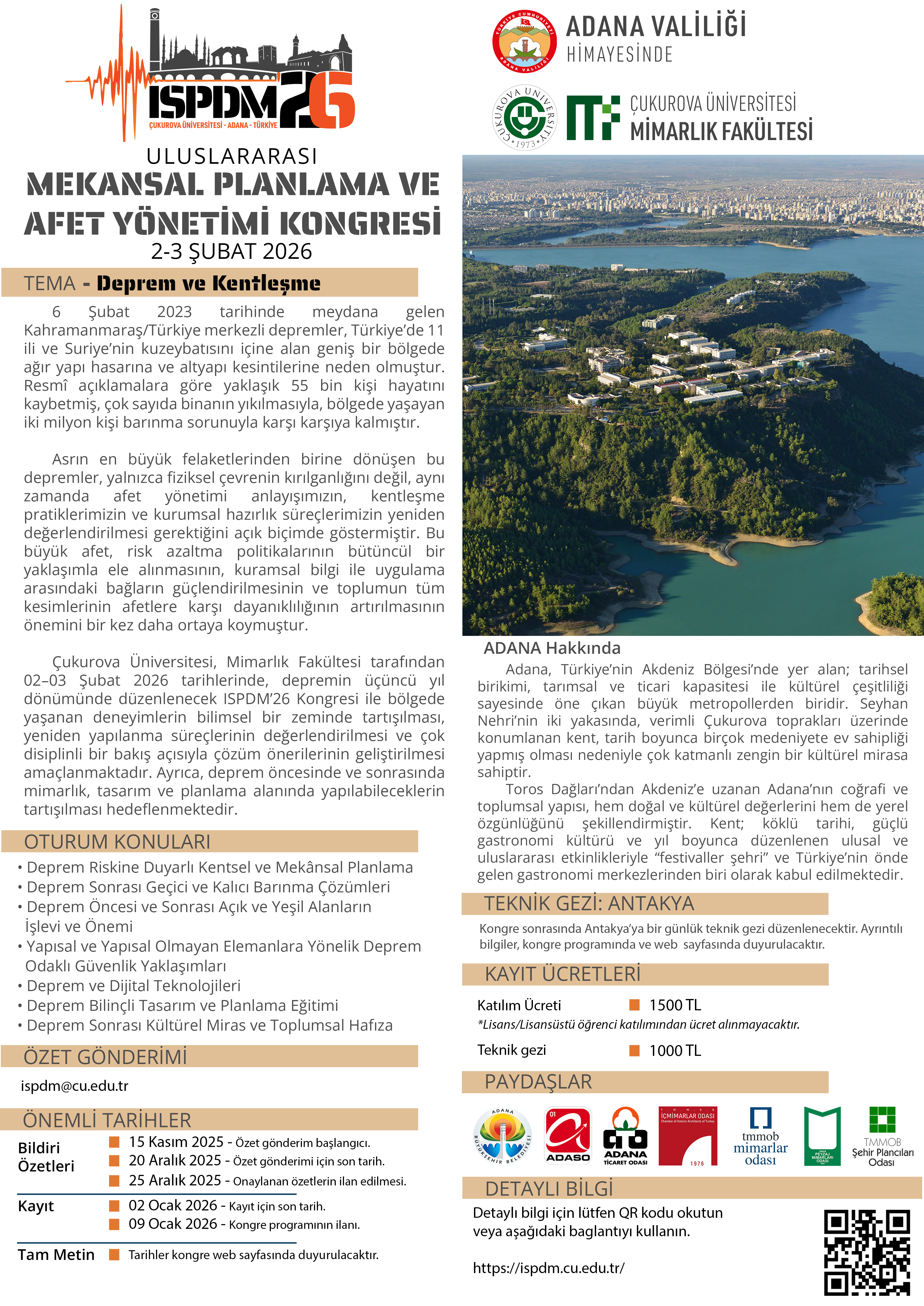 Çukurova Üniversitesi ev sahipliğinde 2-3 Şubat 2026 tarihlerinde düzenlenecek olan Uluslararası Mekansal Planlama ve Afet Yönetimi Kongresi’ne siz değerli araştırmacıları davet etmekten büyük mutluluk duyuyoruz.