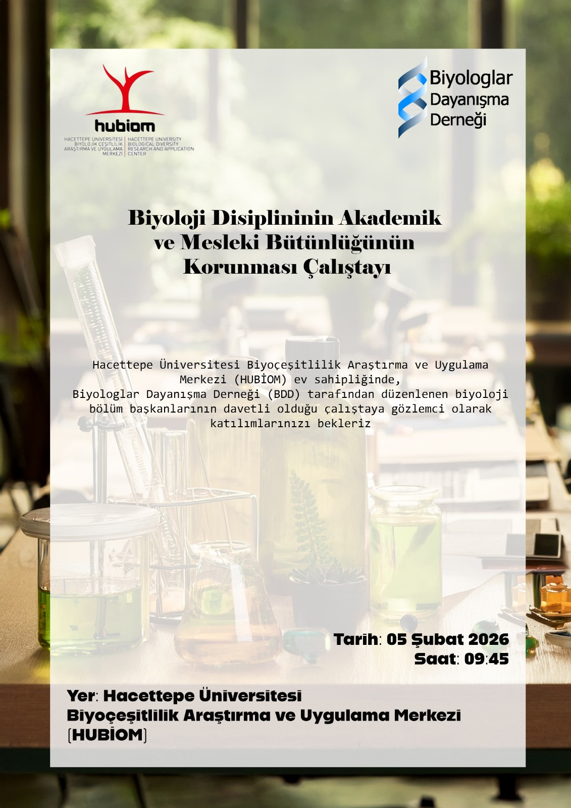 Hacettepe Üniversitesi Biyolojik Çeşitlilik Araştırma ve Uygulama Merkezi (HUBİOM) ev sahipliğinde, Biyologlar Dayanışma Derneği (BDD) tarafından, 5 Şubat 2026 tarihinde HUBİOM Konferans Salonu’nda, bir gün süreli olarak ‘’Biyoloji Disiplininin Akademik ve Mesleki Bütünlüğünün Korunması Çalıştayı’’ düzenlenecektir.