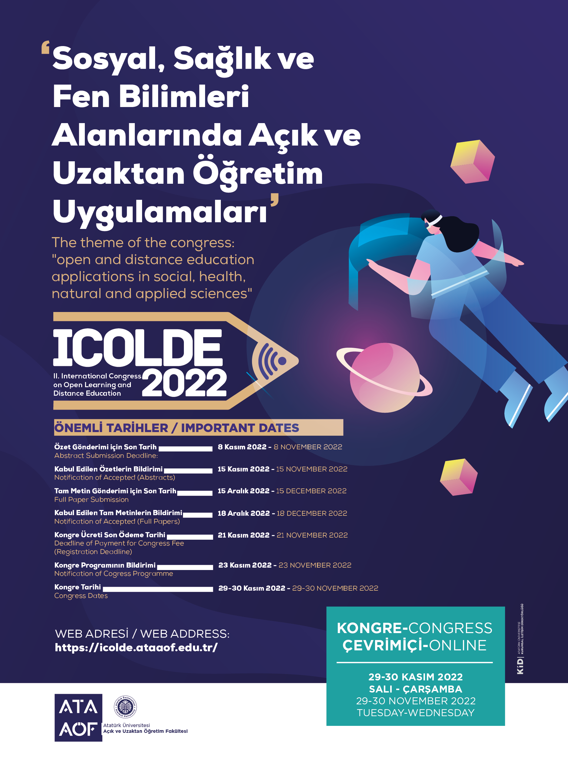 Atatürk Üniversitesi Açık ve Uzaktan Öğretim Fakültesi tarafından 29-30 Kasım 2022 tarihleri arasında “Sosyal, Sağlık ve Fen Bilimleri Alanlarında Açık ve Uzaktan Öğretim Uygulamaları” konulu kongre düzenlenecektir.